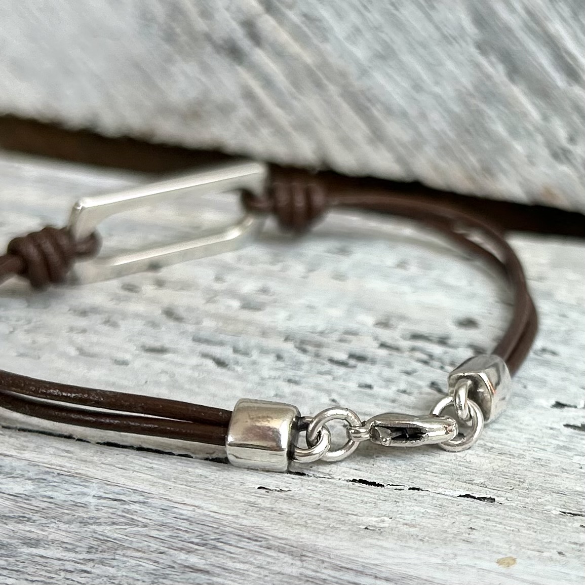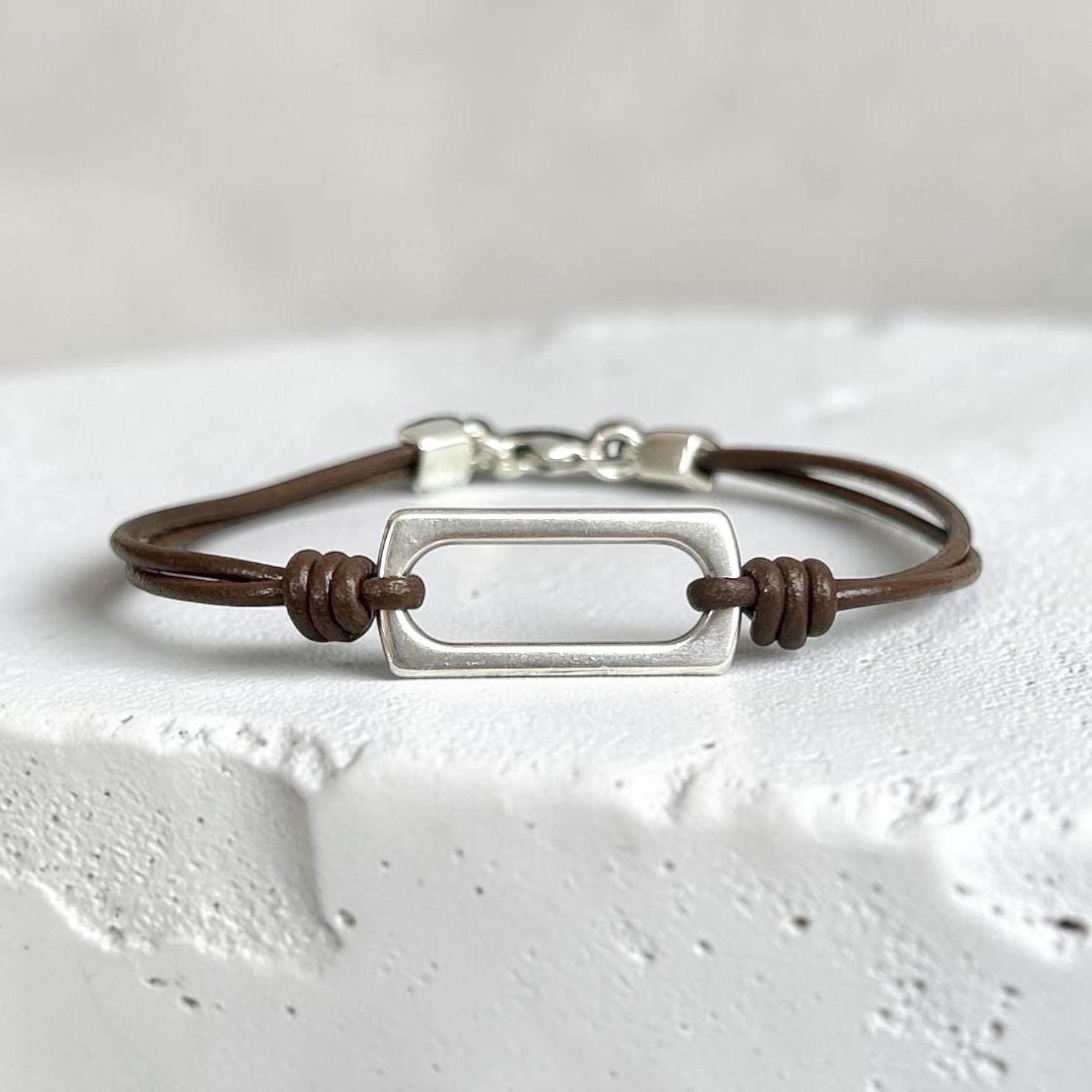 Obdélníkový komponent na kulaté přirodní kůži.