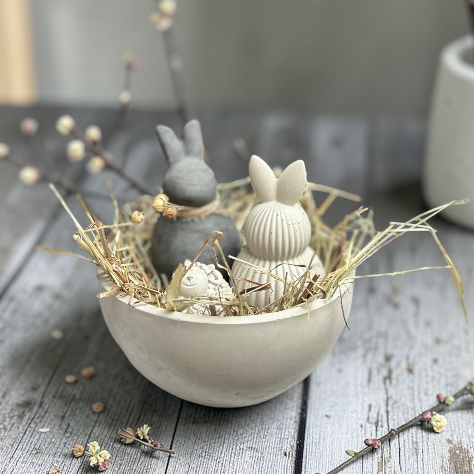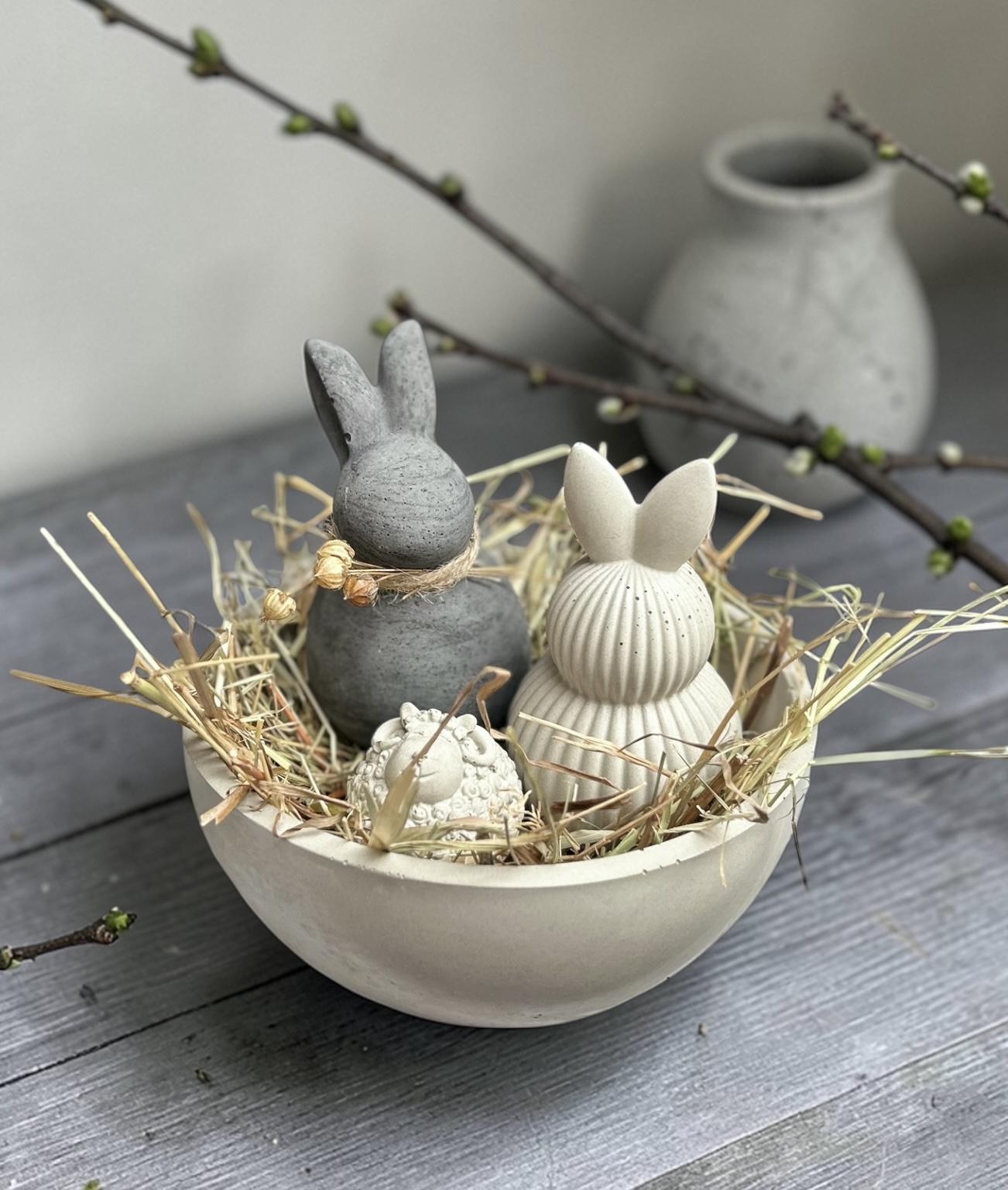 Velikonoční sada, která by vám o Velikonocích neměla chybět. Krásný originální doplněk do vašeho bydlení se skládá z misky, dvou zajíčků a malé ovečky a to všechno samozřejmě se senovou nadílkou.
